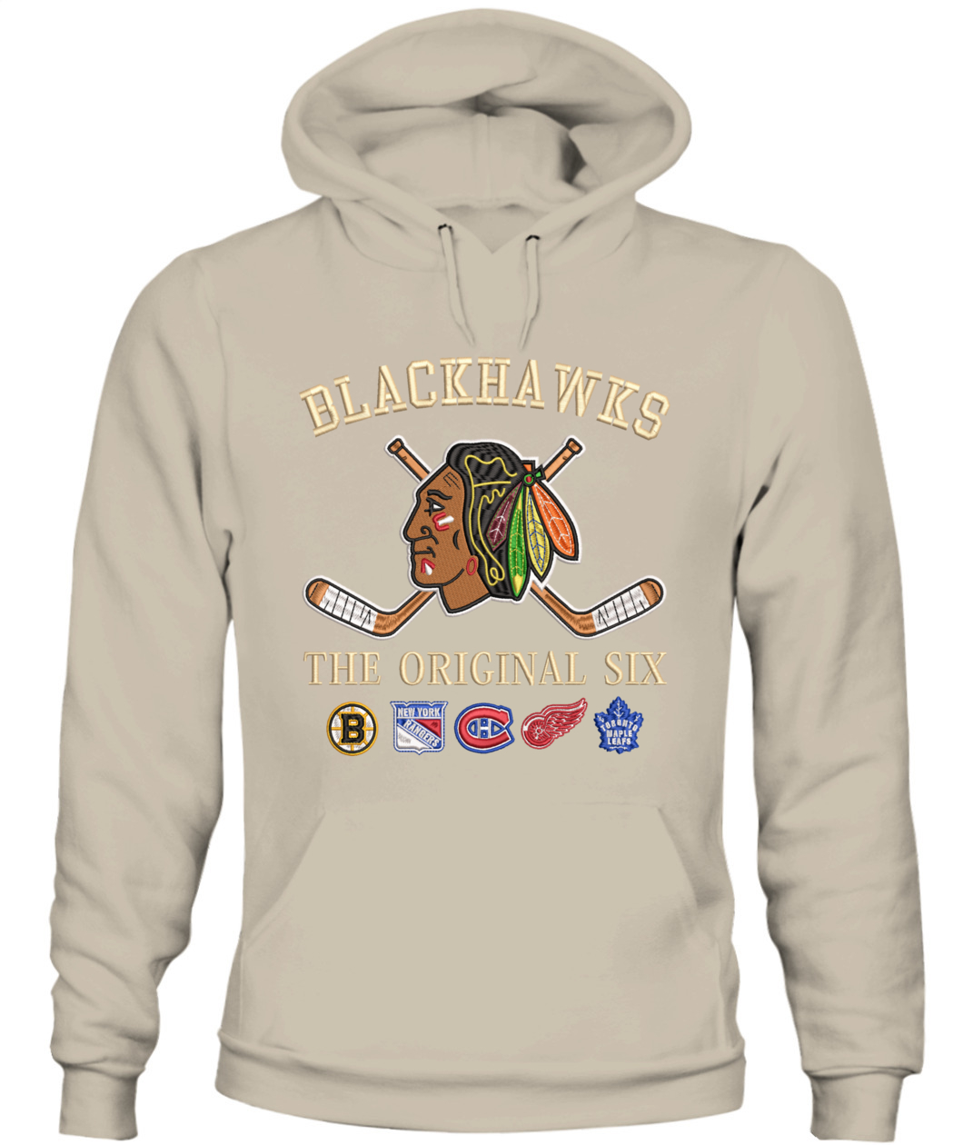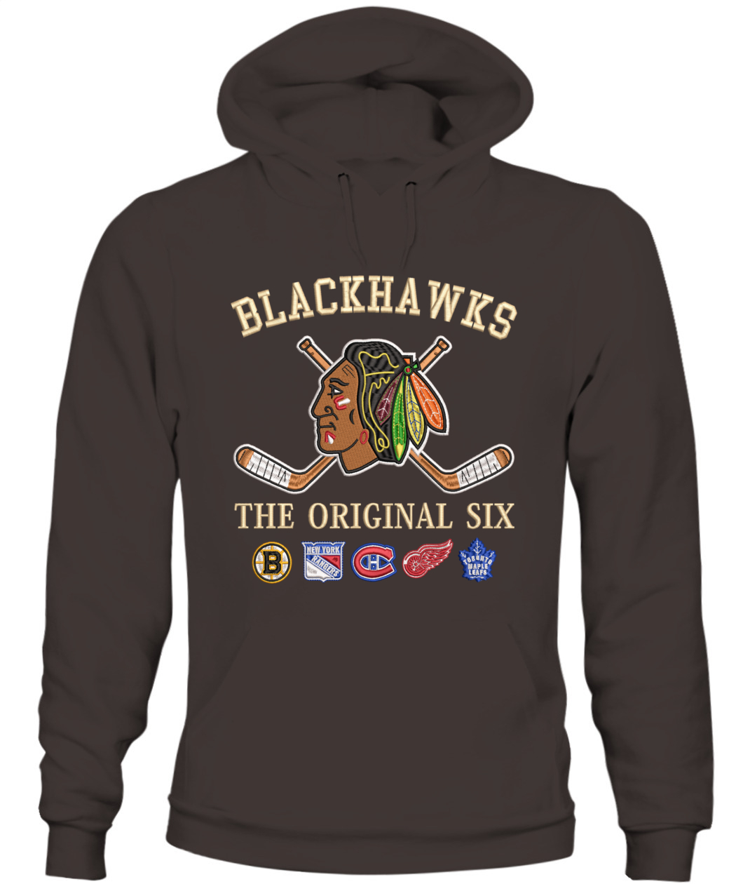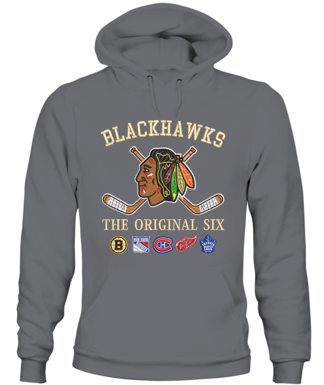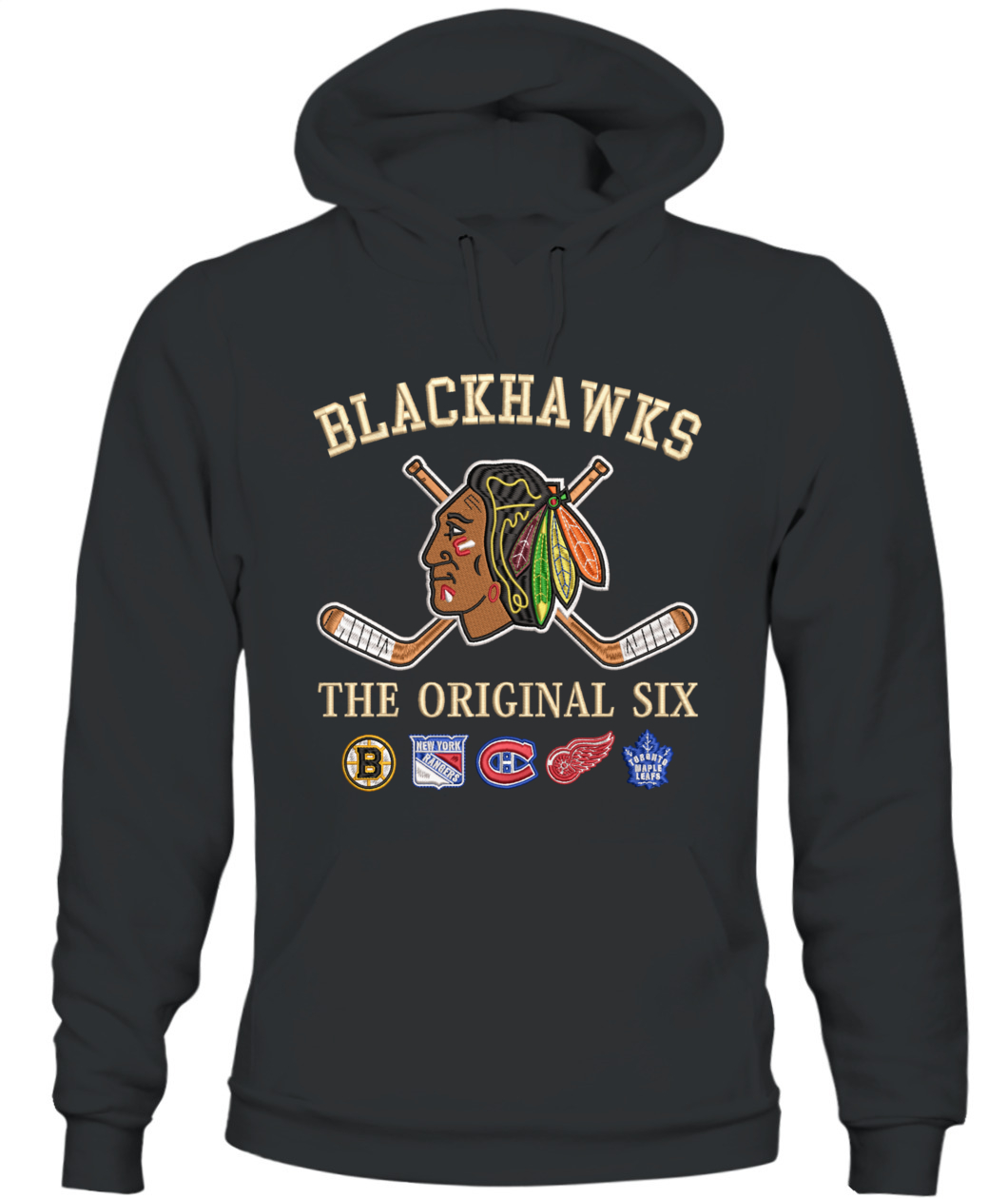 Wear the founding legacy! This Chicago Blackhawks Hoodie features premium real embroidery of the Indian Head logo and the full Original Six combined lineup. Crafted for the true hockey traditionalist. 🦅🏒