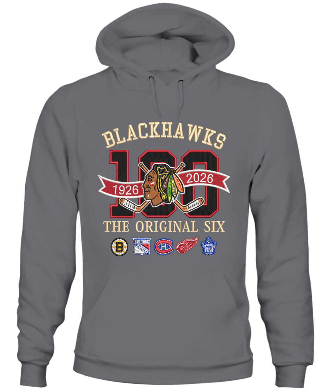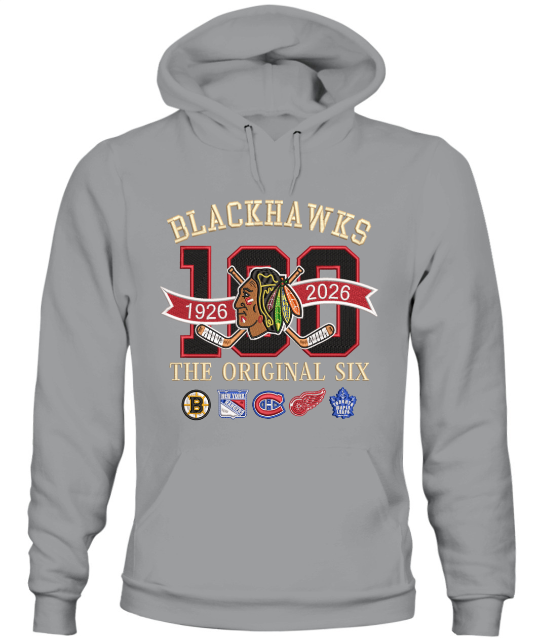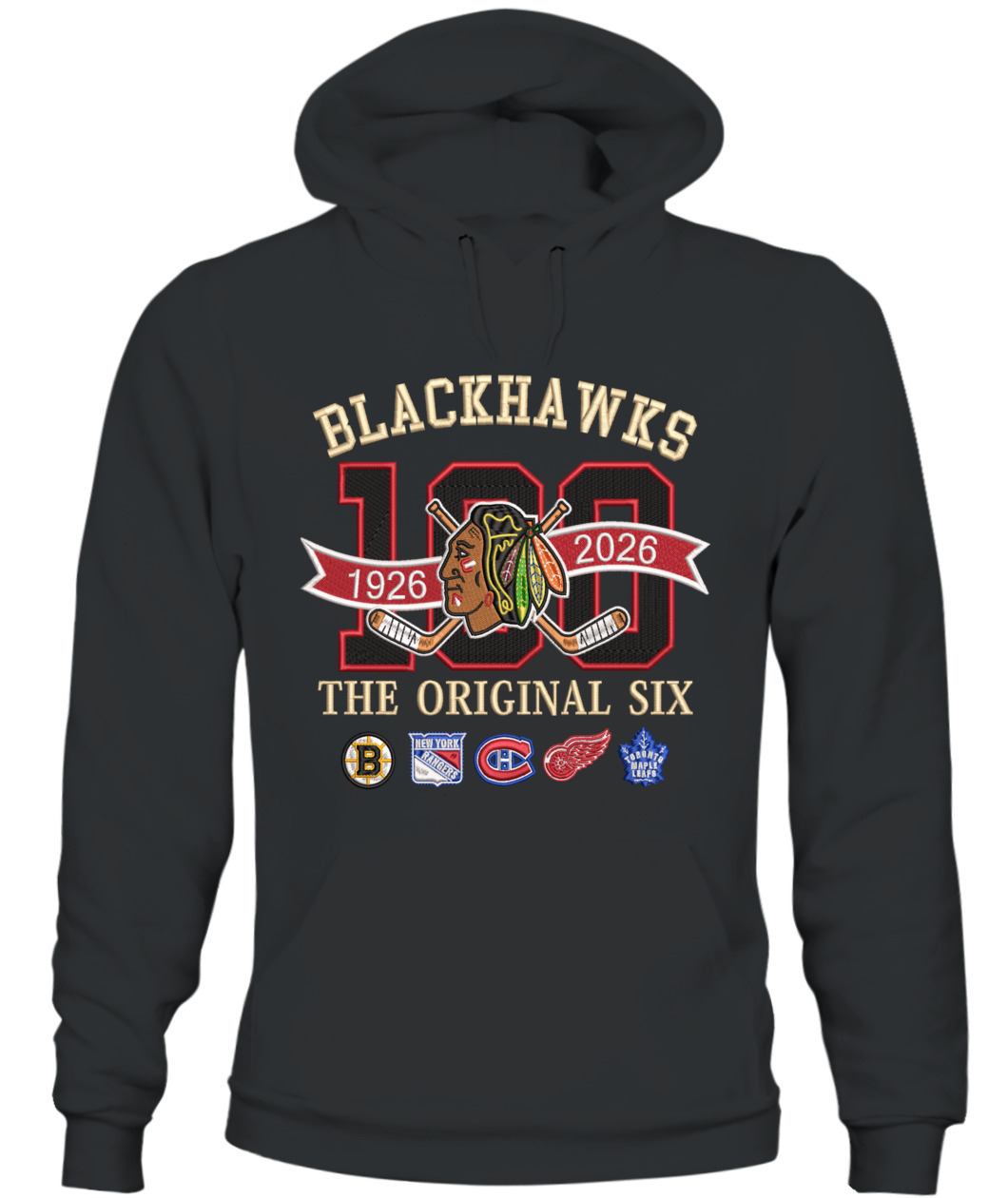 A century of power! This Chicago Blackhawks Hoodie features premium real embroidery of the 100th Anniversary logo and the full Original Six lineup. A heavy-duty classic for the ultimate fan.