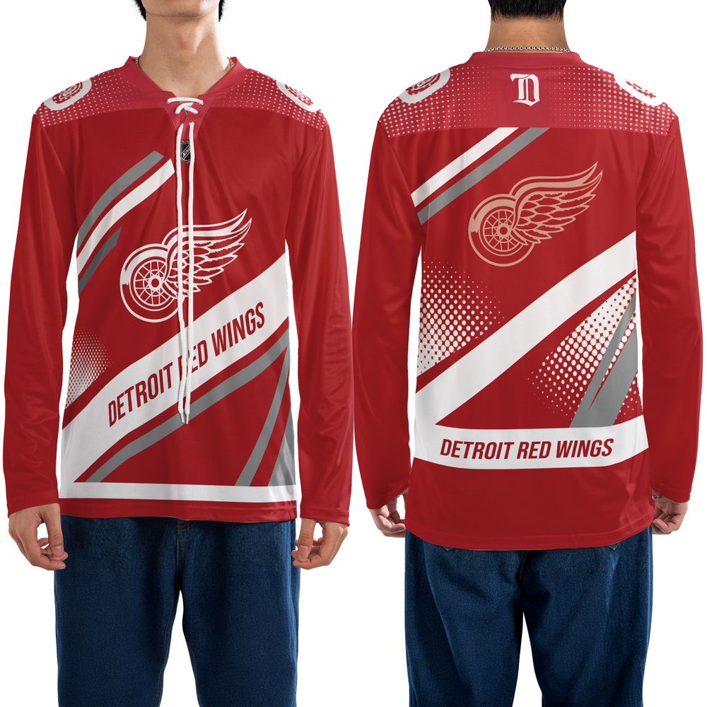 Show your Red Wings pride with this modern Lace Neck Fan Jersey Shirt. Featuring the Winged Wheel logo and dynamic striped graphics for a sleek, comfortable fan look. 🔴🏒