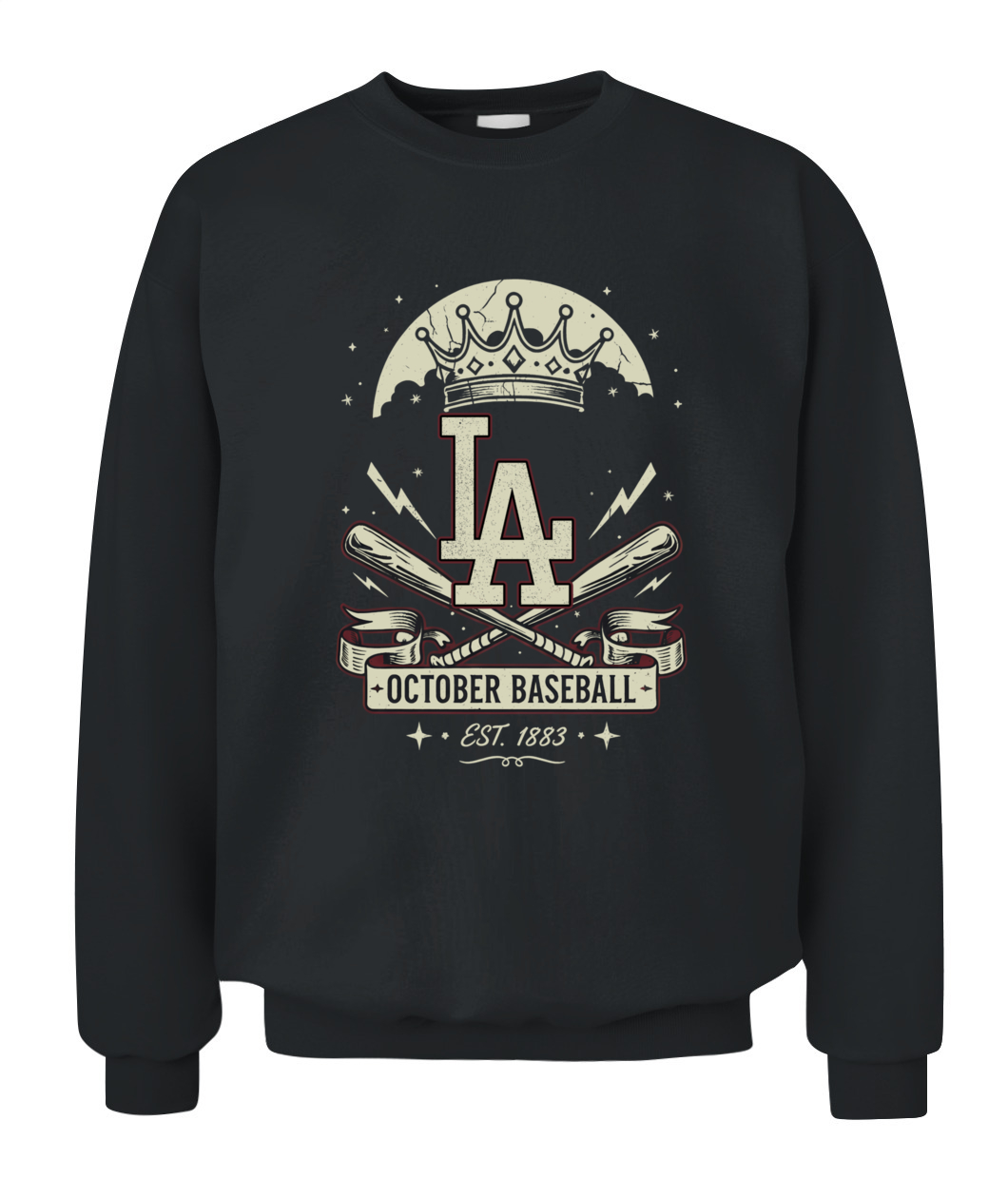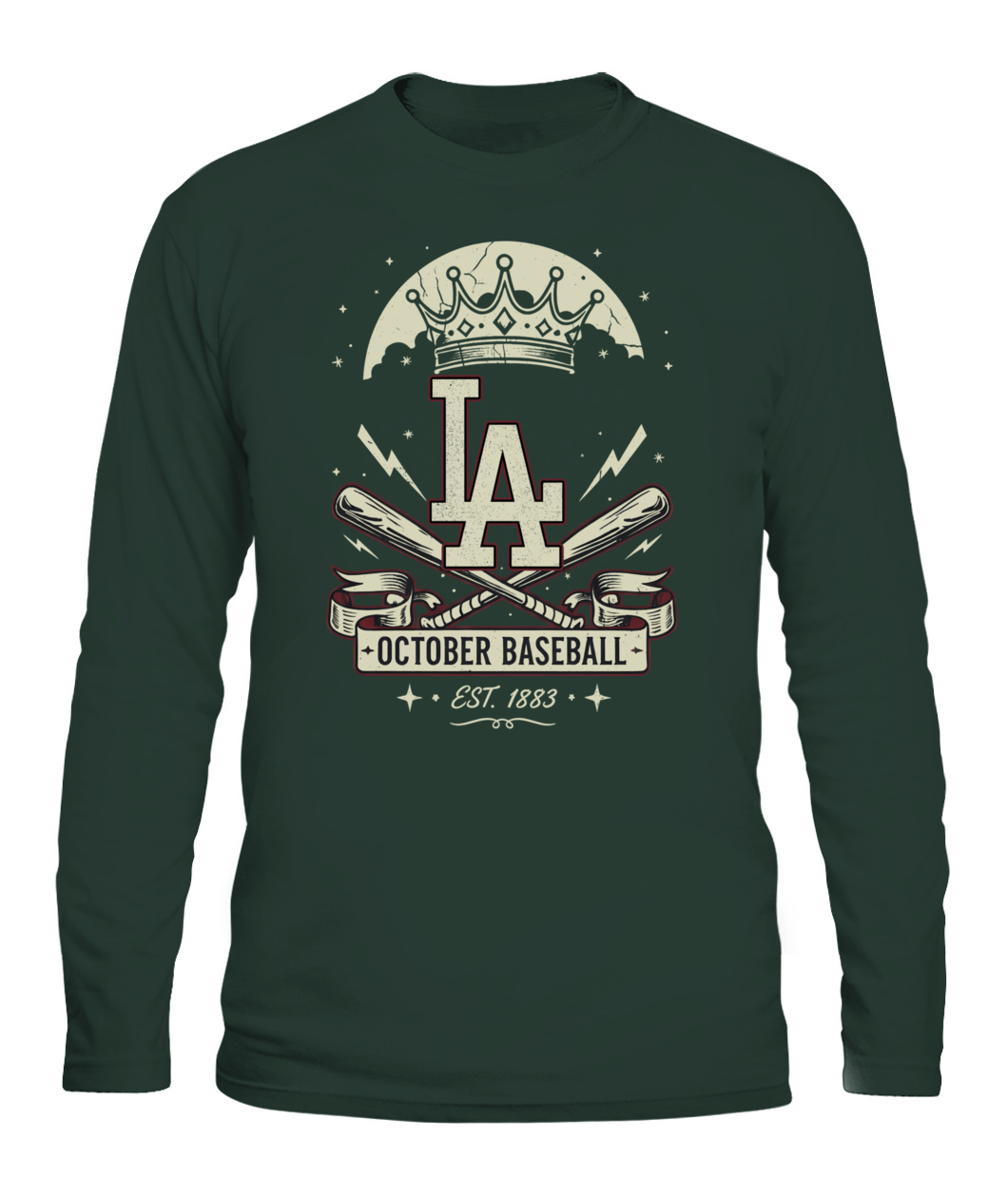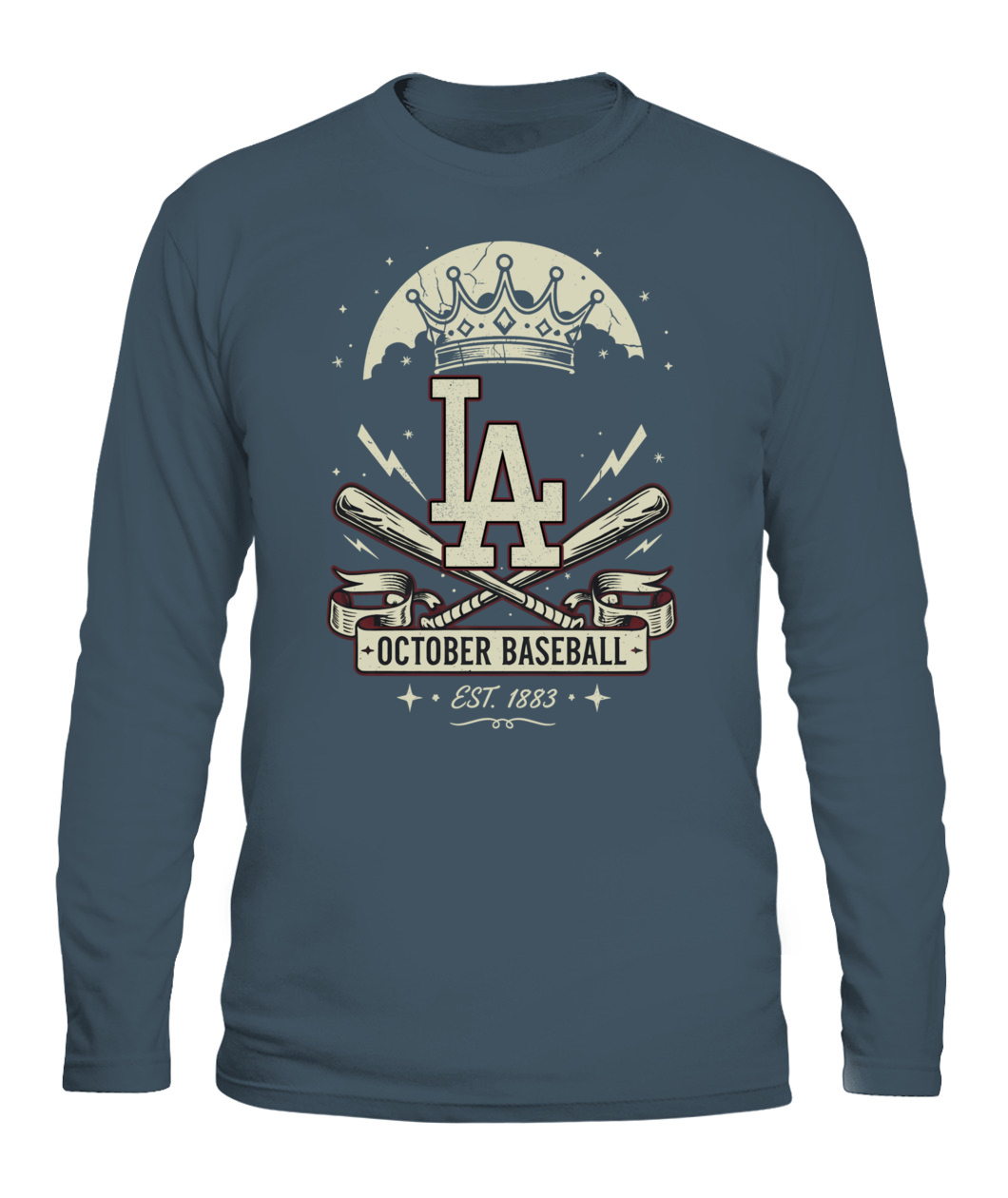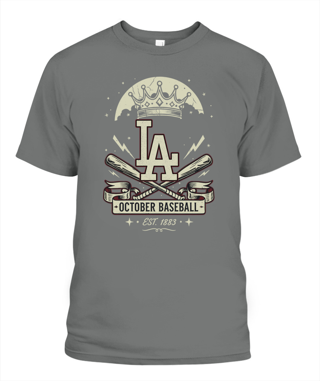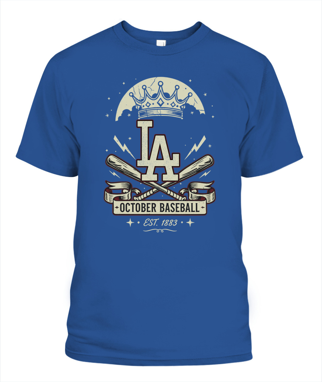 The “October Baseball” Dodgers tee celebrates postseason tradition with a bold crown-and-bats design, honoring LA’s legacy under the lights of October