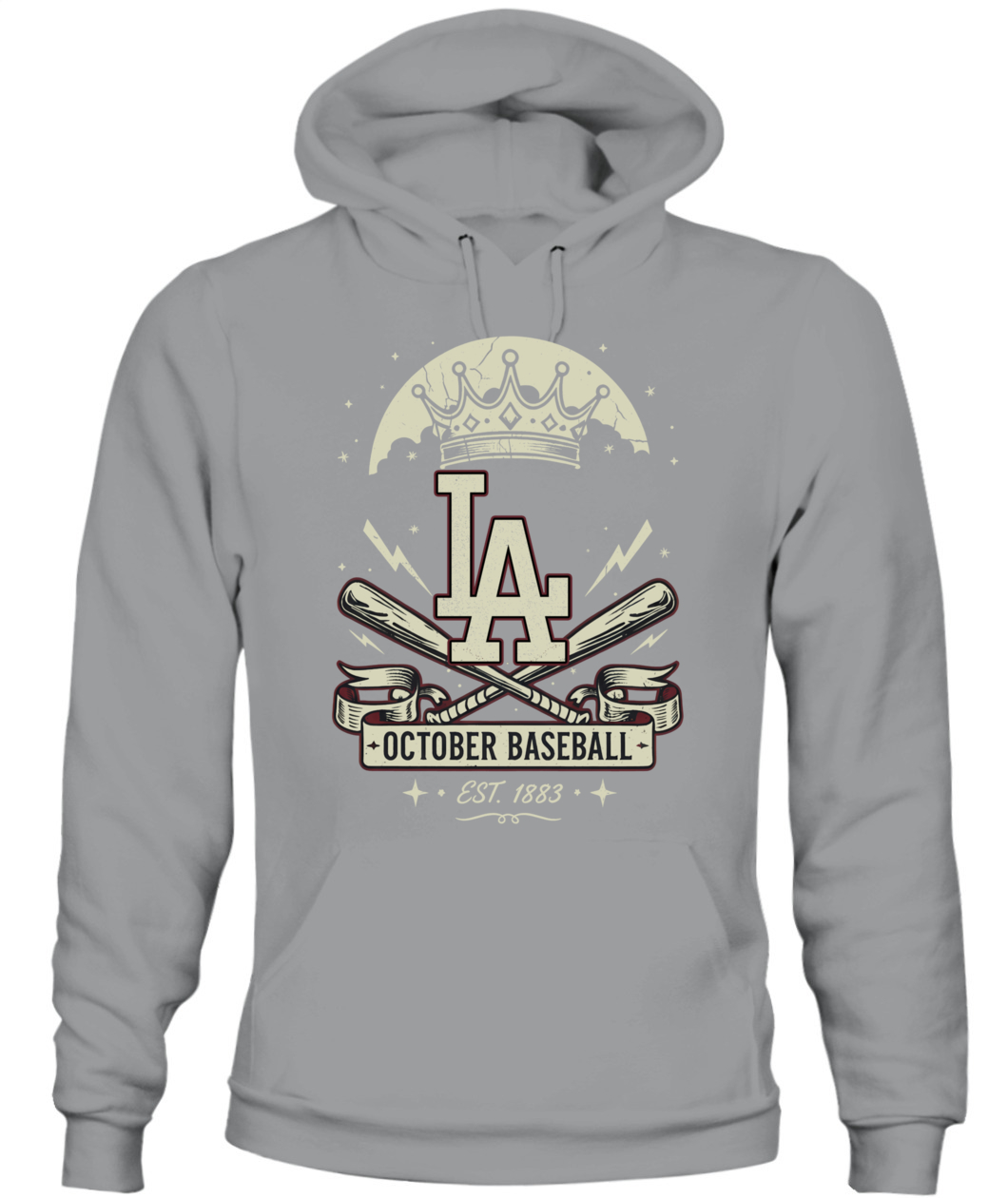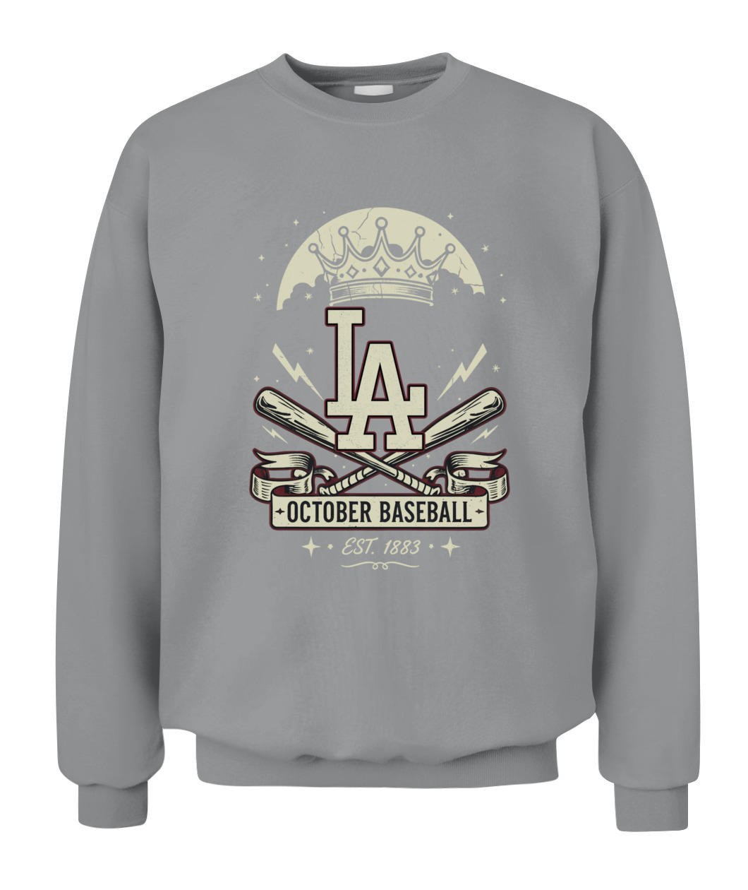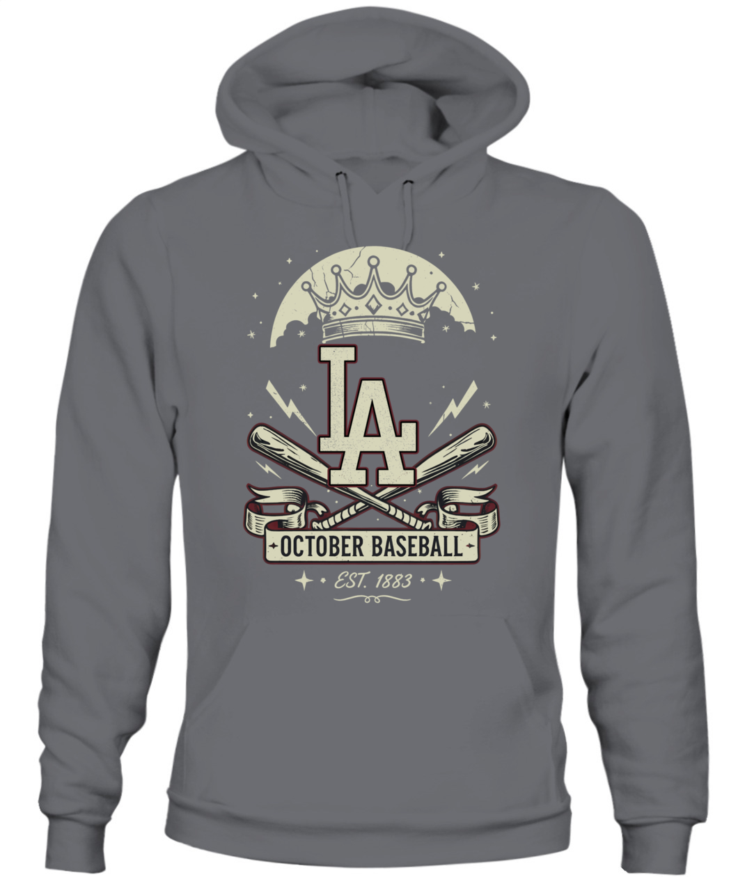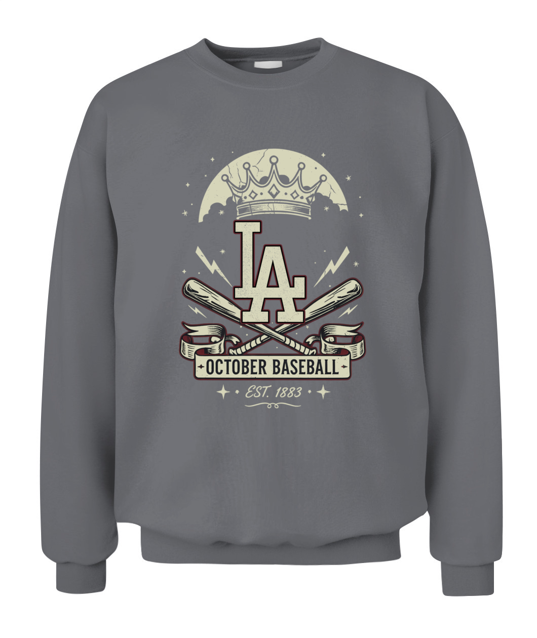 The “October Baseball” Dodgers tee celebrates postseason tradition with a bold crown-and-bats design, honoring LA’s legacy under the lights of October