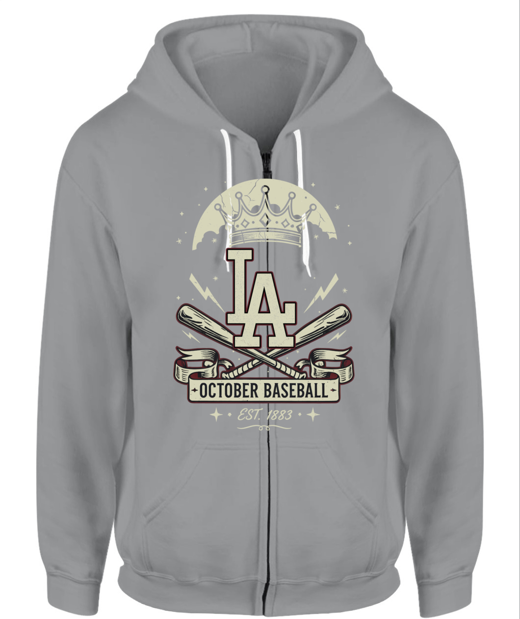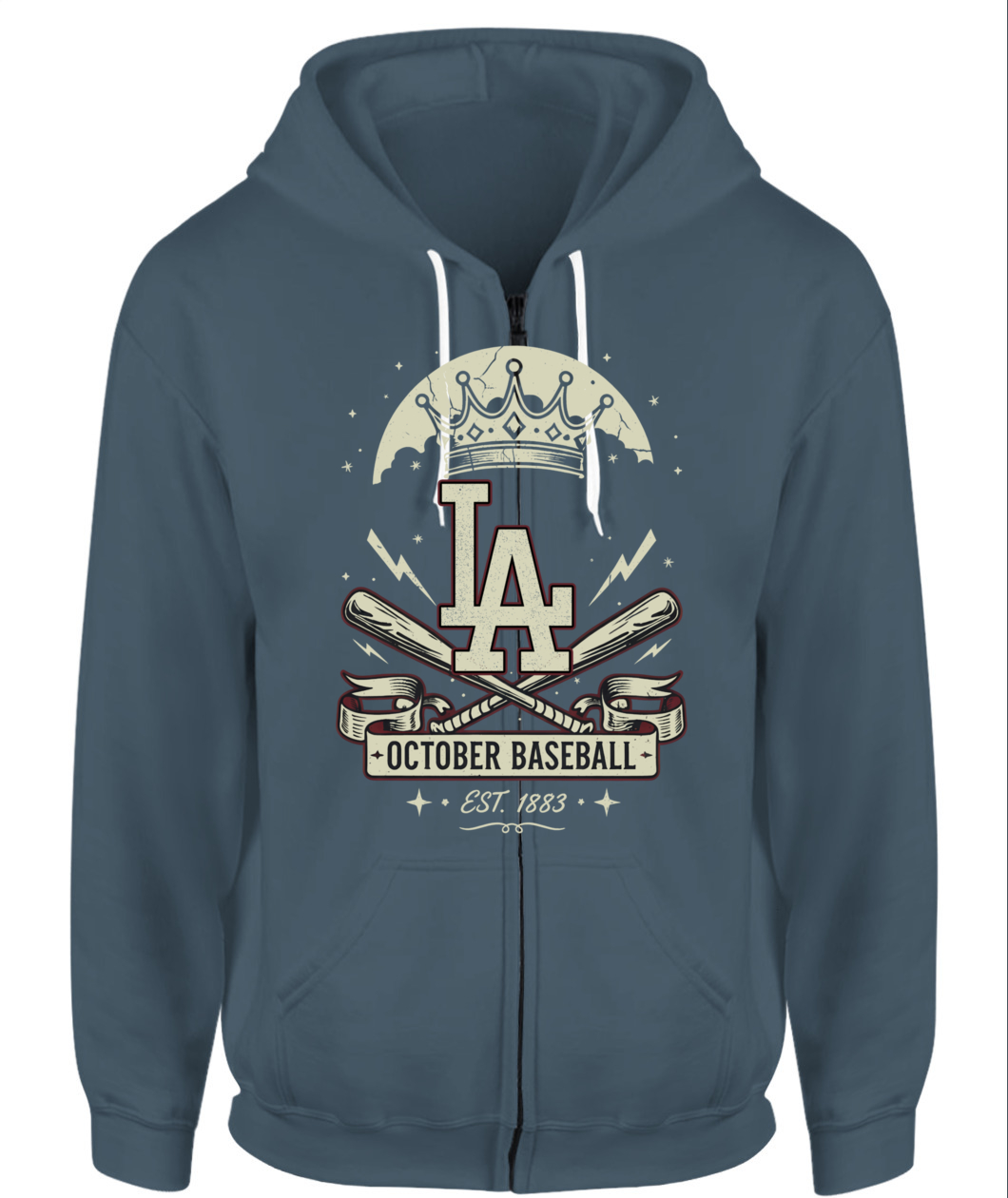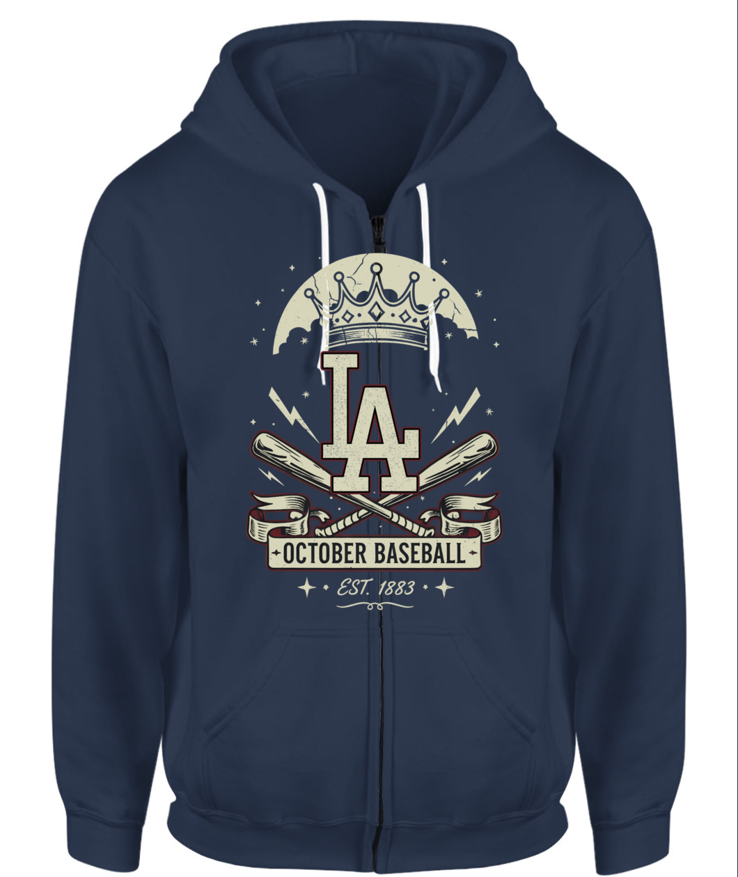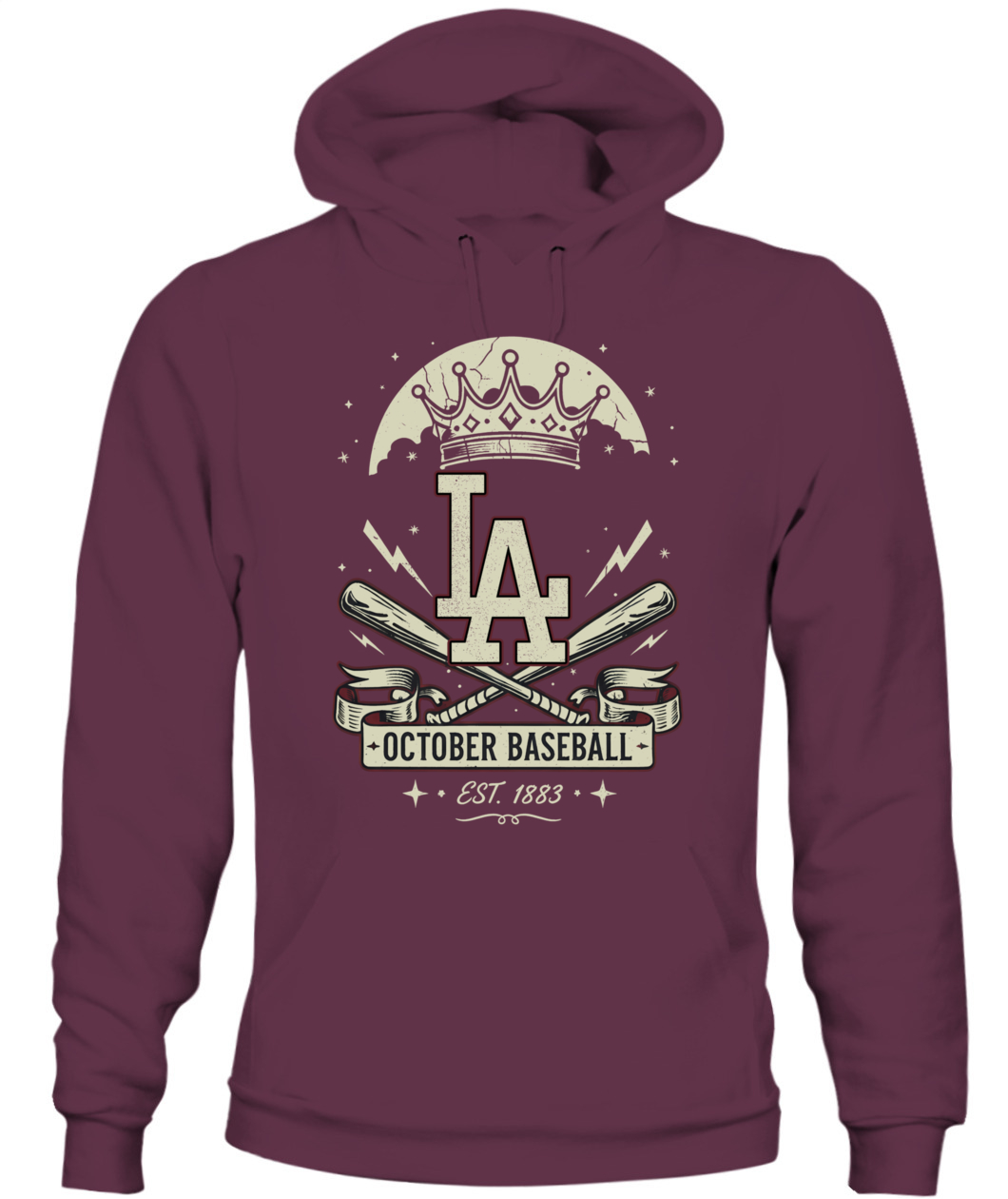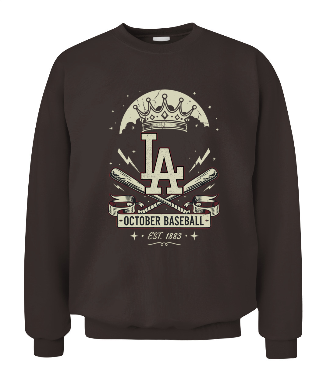 The “October Baseball” Dodgers tee celebrates postseason tradition with a bold crown-and-bats design, honoring LA’s legacy under the lights of October