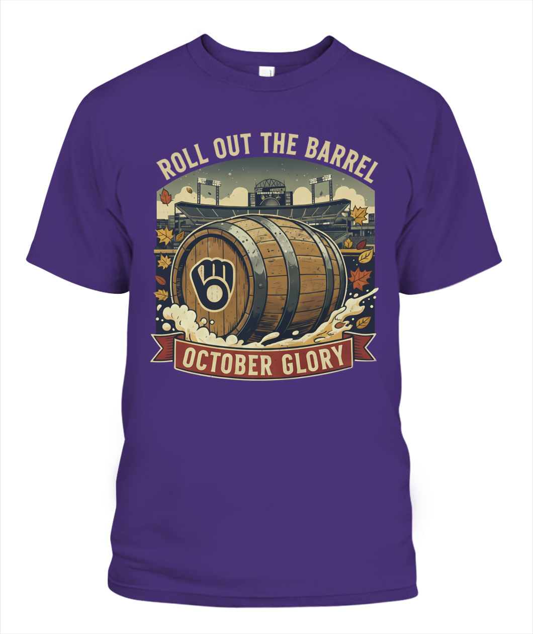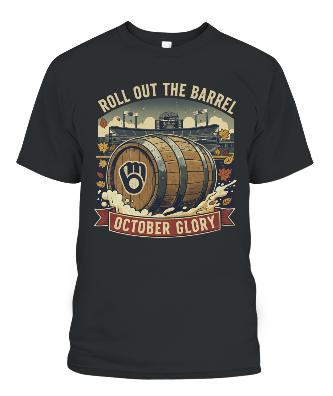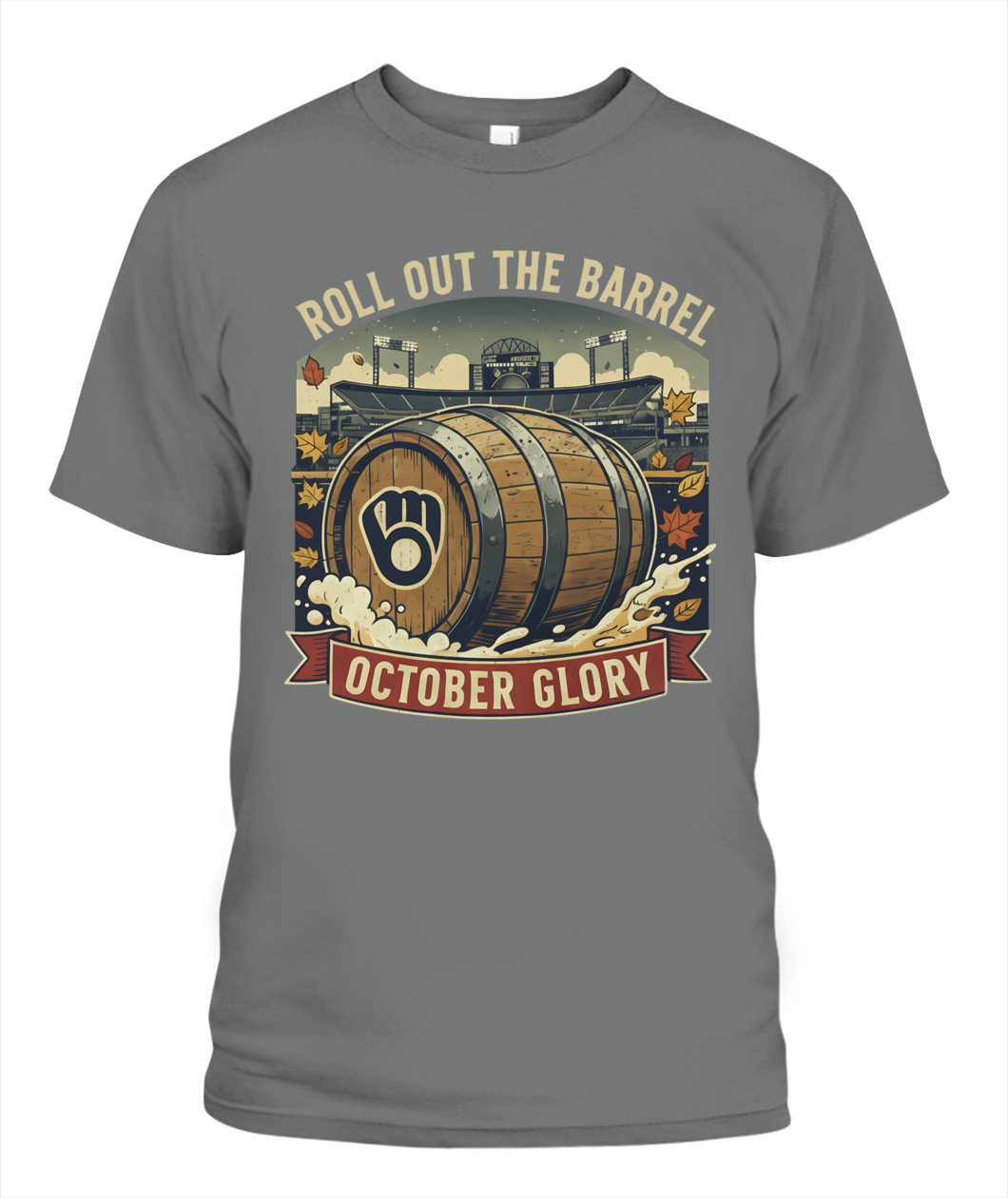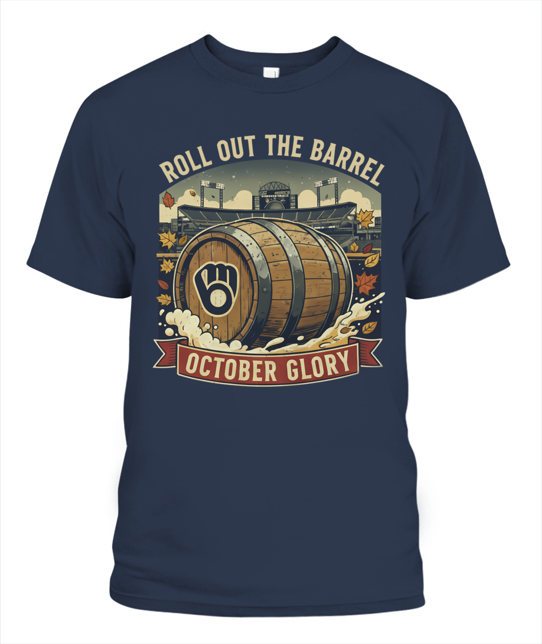 The “Roll Out the Barrel: October Glory” Brewers tee blends baseball and beer heritage into one bold playoff design. Celebrate Milwaukee’s October spirit with this must-have shirt.