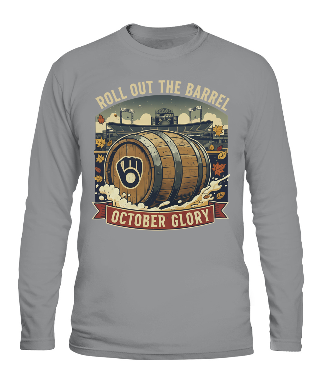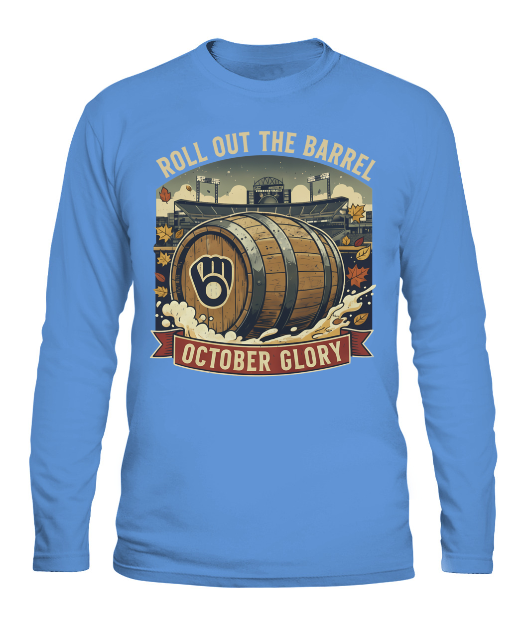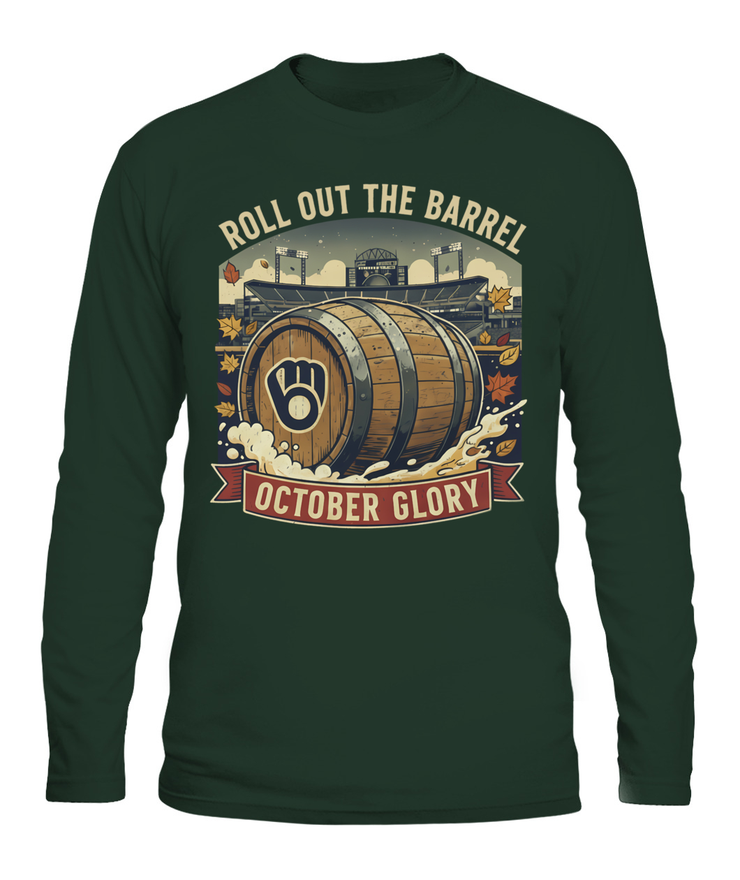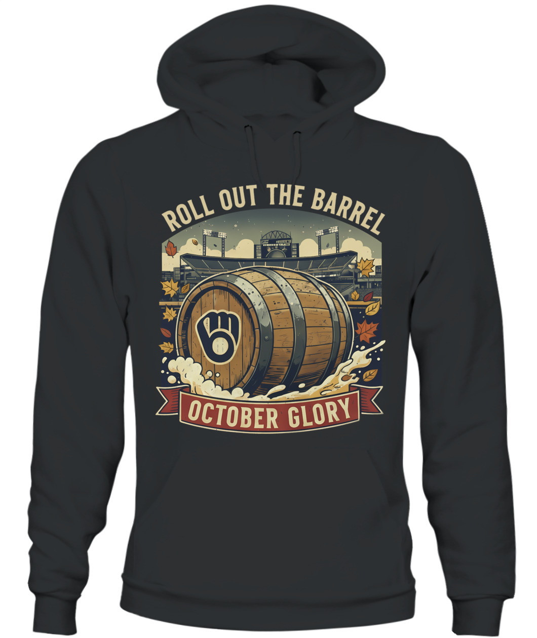 The “Roll Out the Barrel: October Glory” Brewers tee blends baseball and beer heritage into one bold playoff design. Celebrate Milwaukee’s October spirit with this must-have shirt.