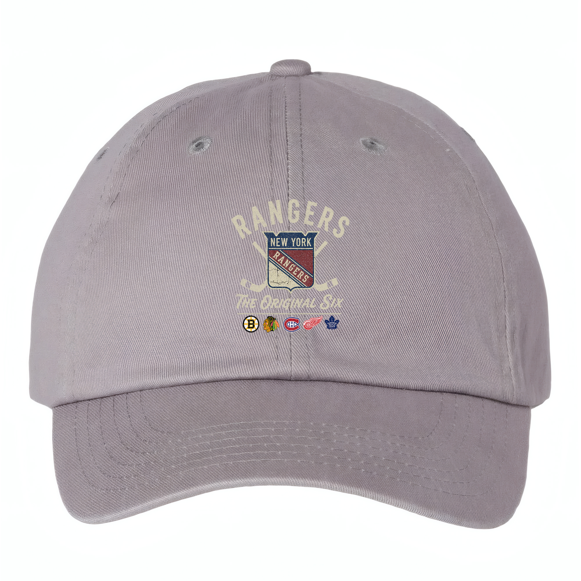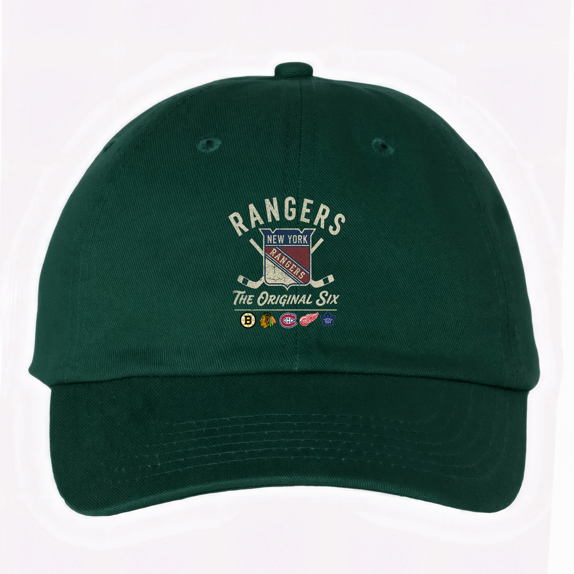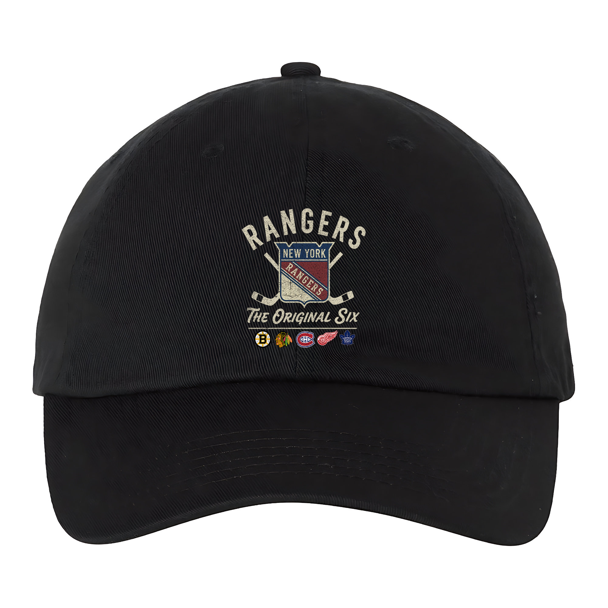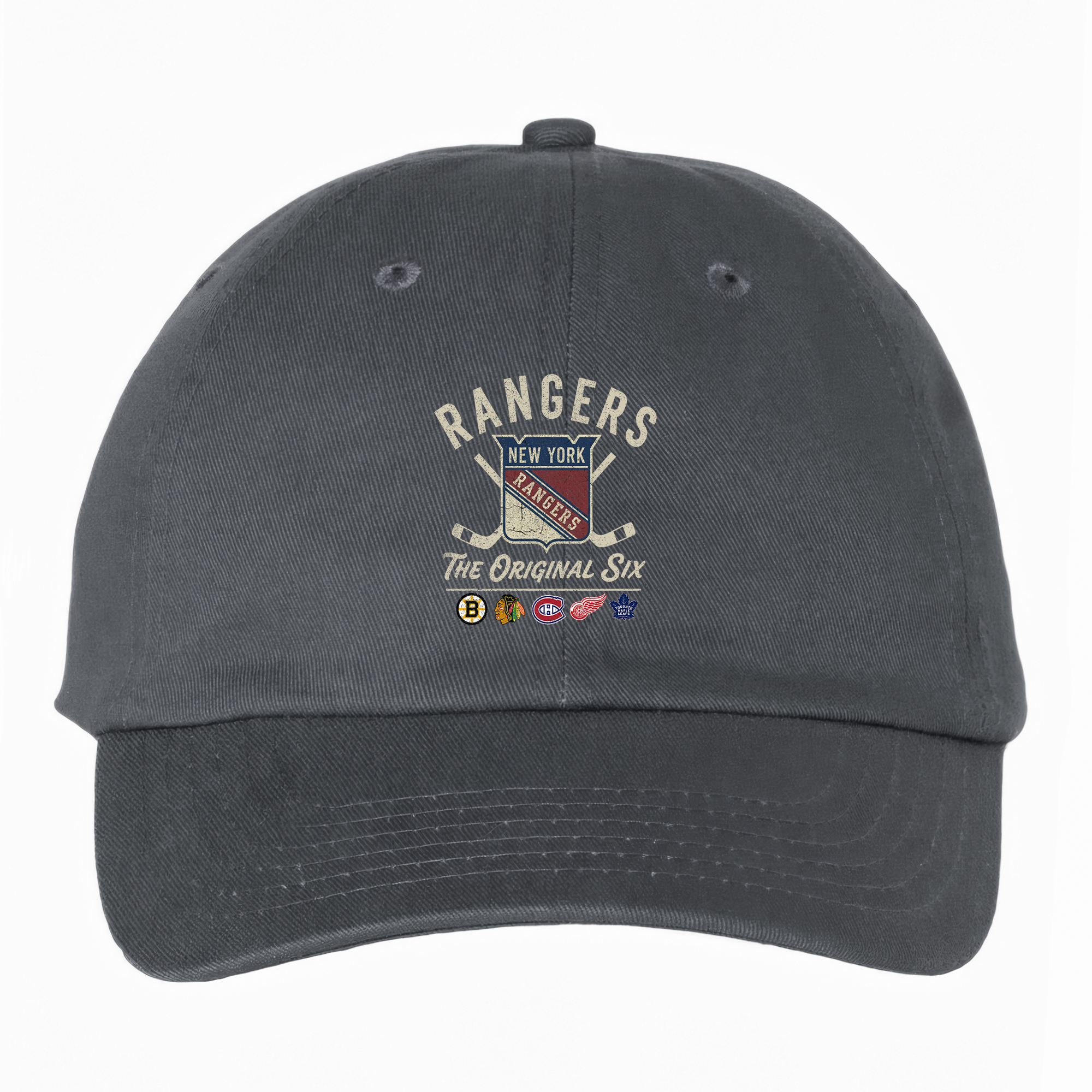 A vintage classic! This NY Rangers Dad Hat pays tribute to "The Original Six" with a bio-washed finish and all six founding team logos. Blue Line Heritage!