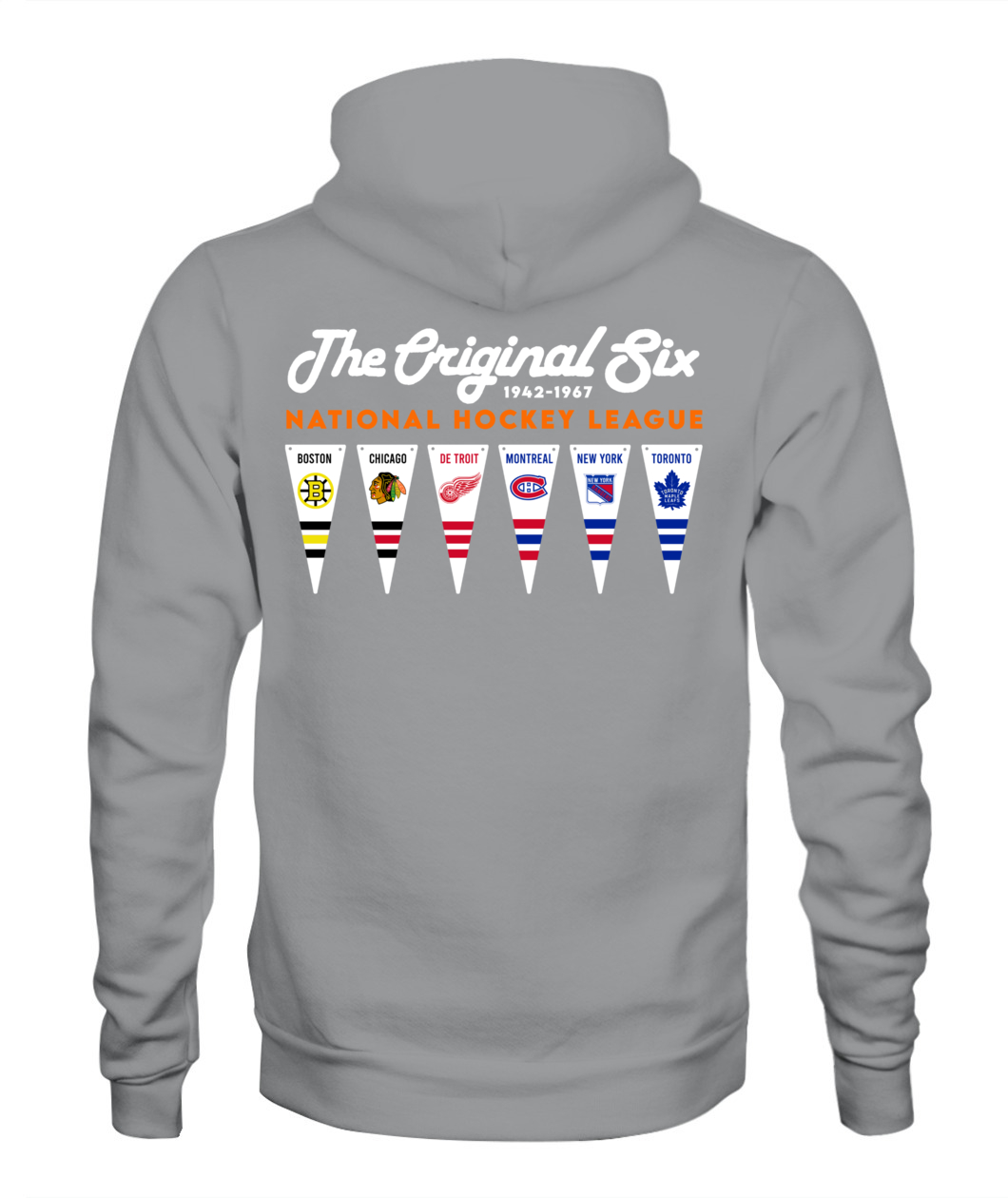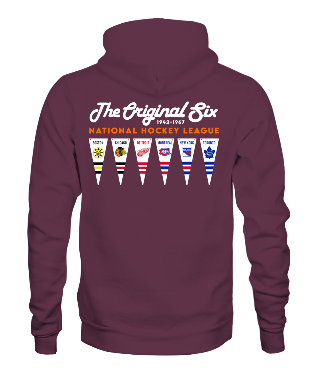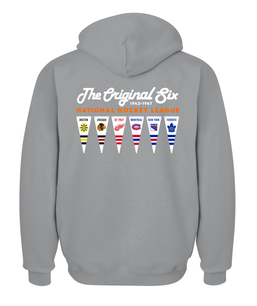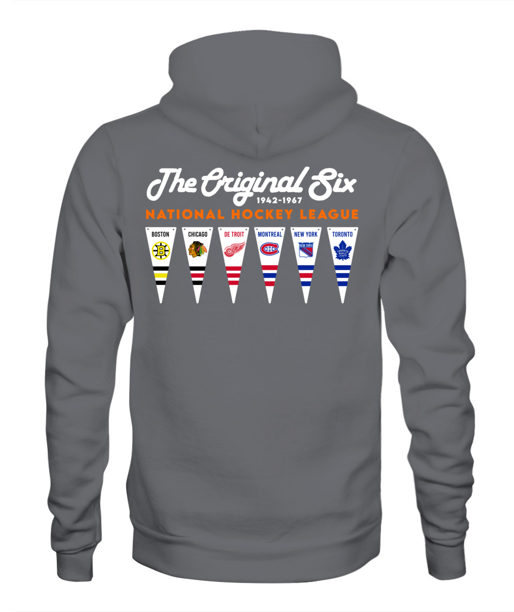 The ultimate heritage piece! This Original Six Hoodie features six pennant flags celebrating the founding NHL teams and the legendary 1942-1967 era.