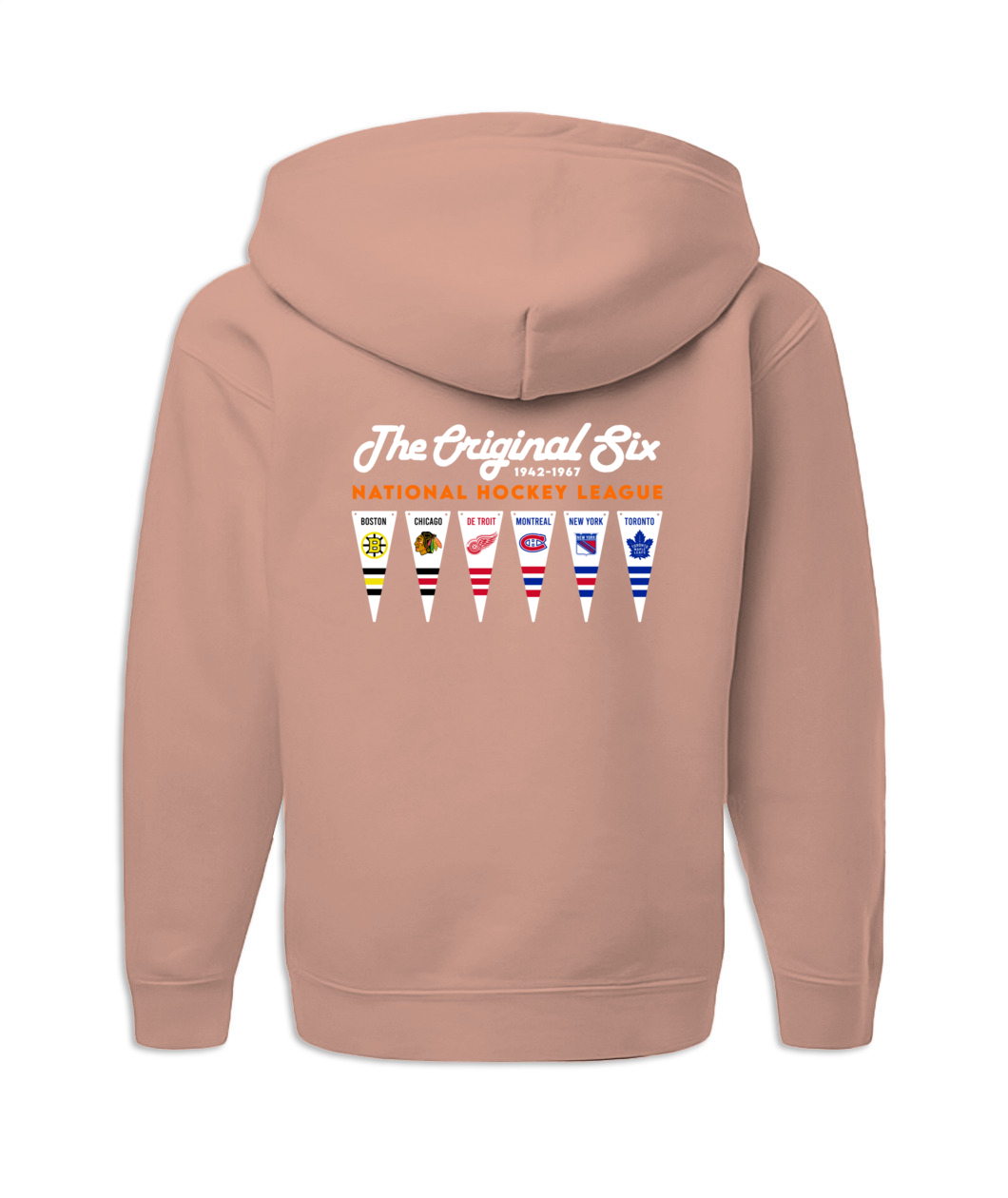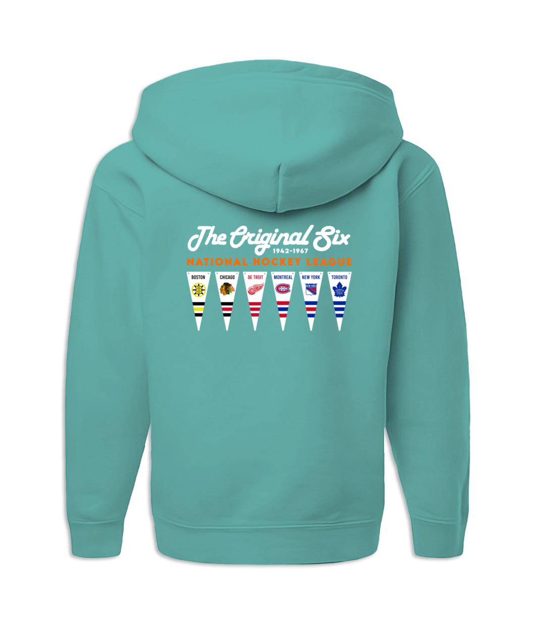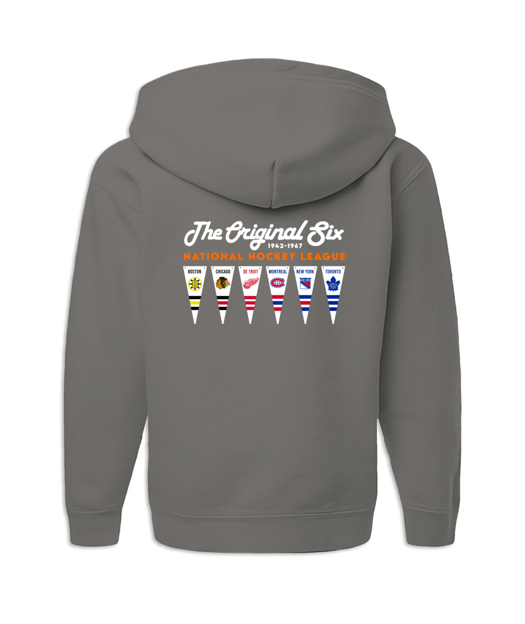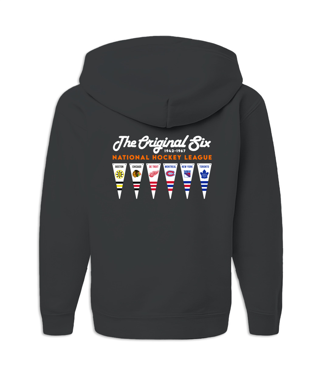 The ultimate heritage piece! This Original Six Hoodie features six pennant flags celebrating the founding NHL teams and the legendary 1942-1967 era.