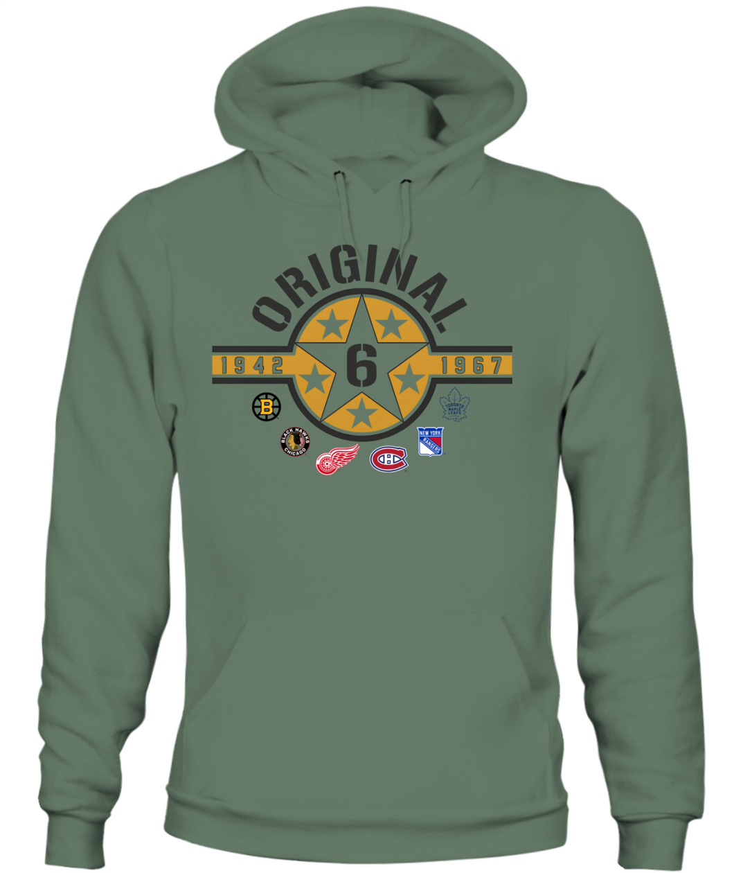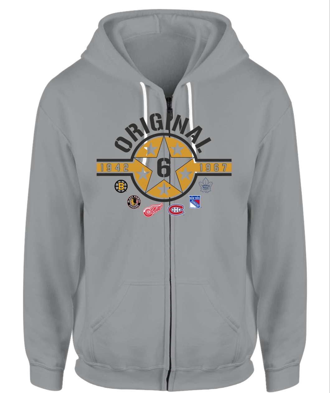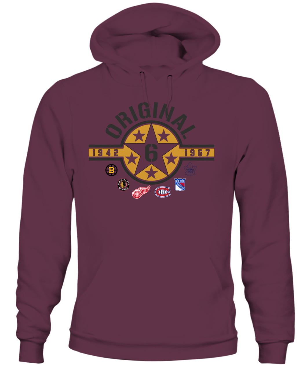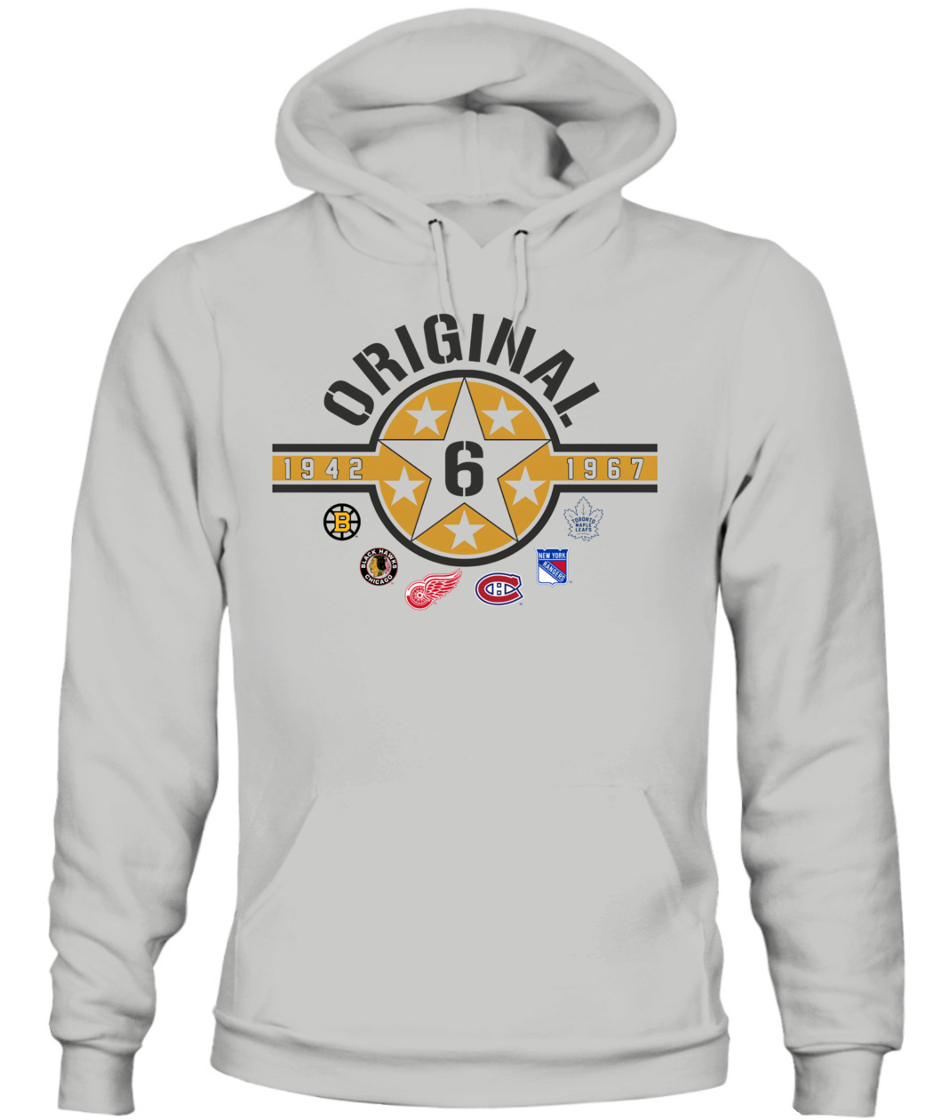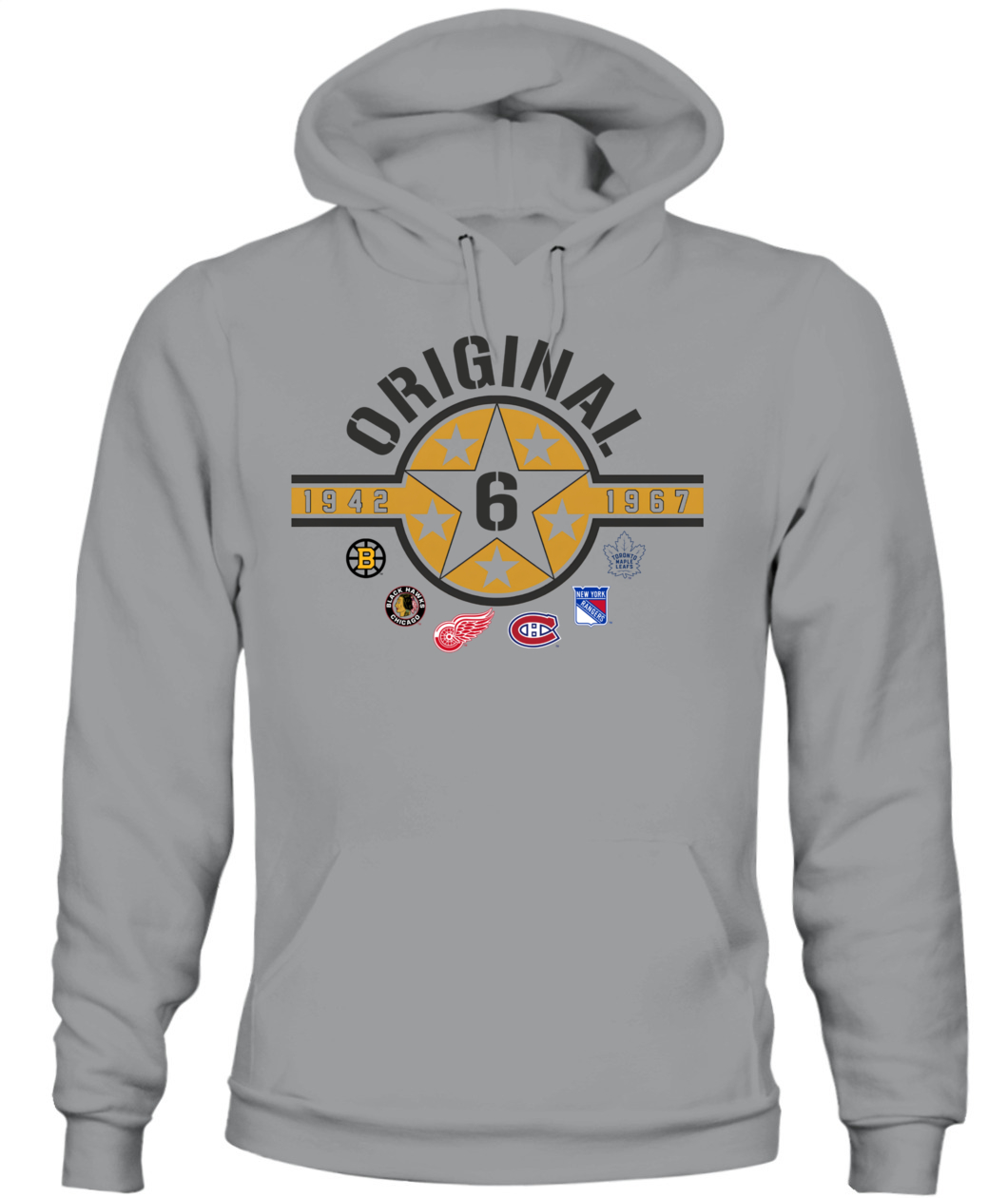 Wear the founding stars of the NHL! This Original Six Hoodie features a bold Star Badge with the number 6, honoring all six teams and the historic 1942-1967 era. ORIGINAL!