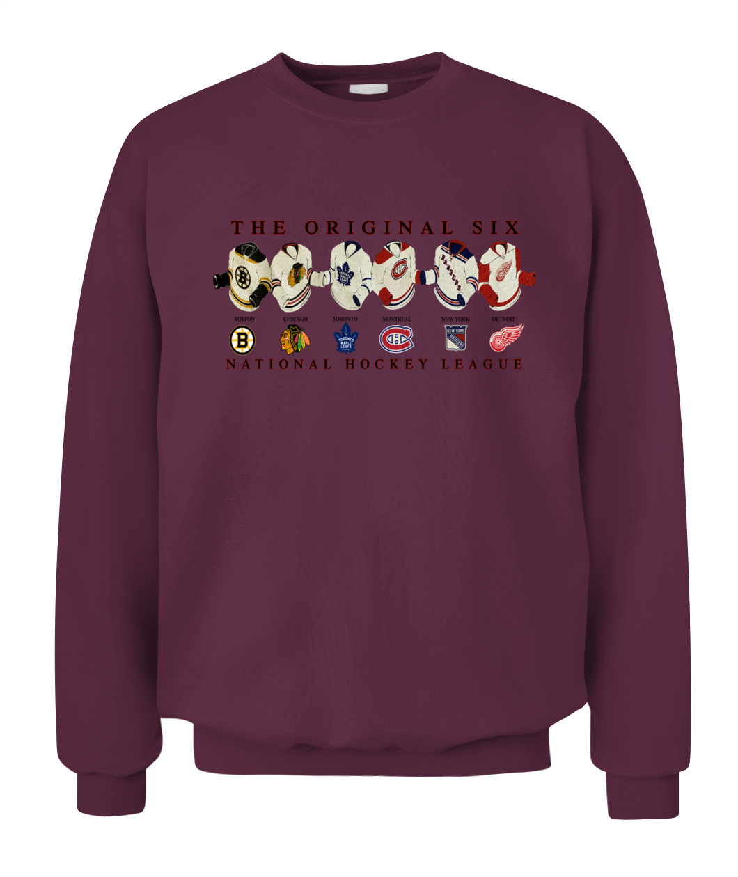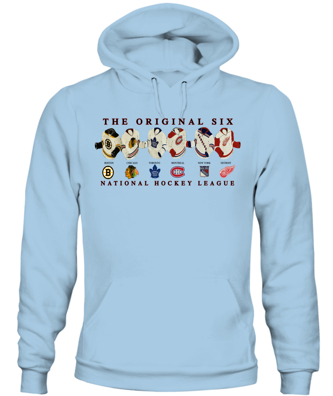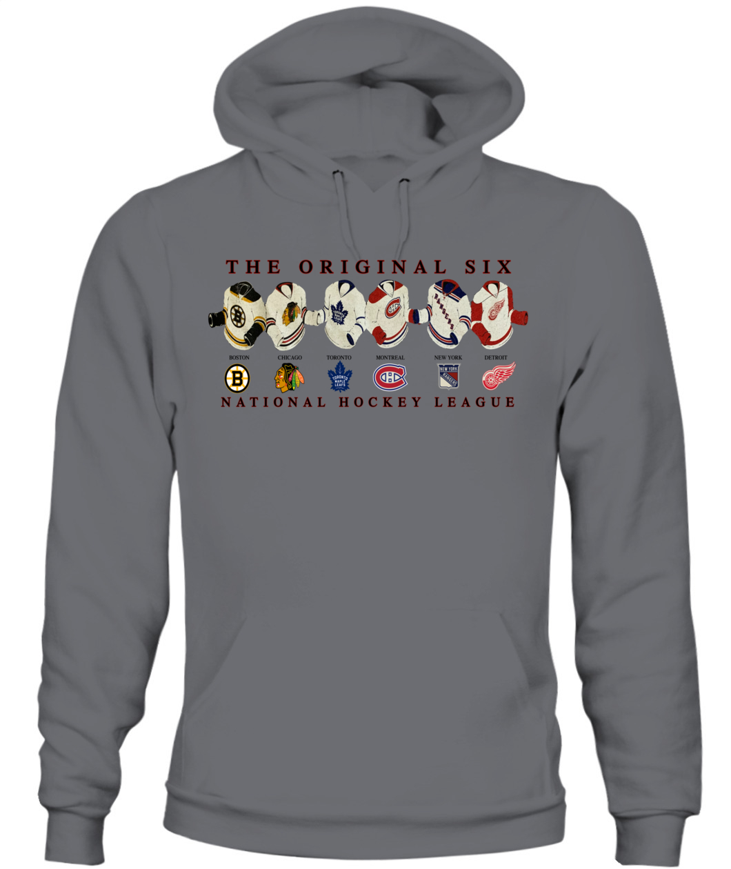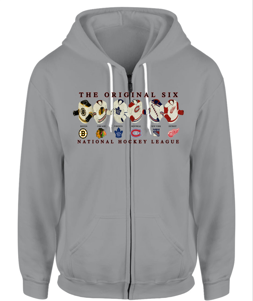 Honor NHL History! This hoodie features the classic jerseys of all "The Original Six" teams—Boston, Chicago, Toronto, Montreal, New York, and Detroit. A true heritage piece! 👑🏒