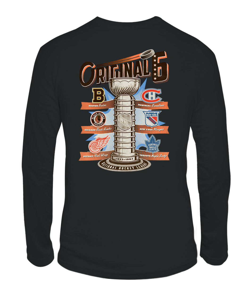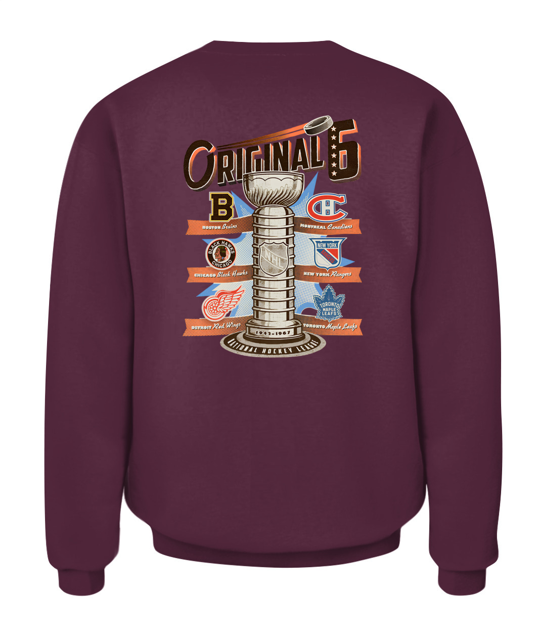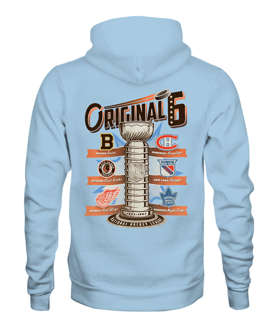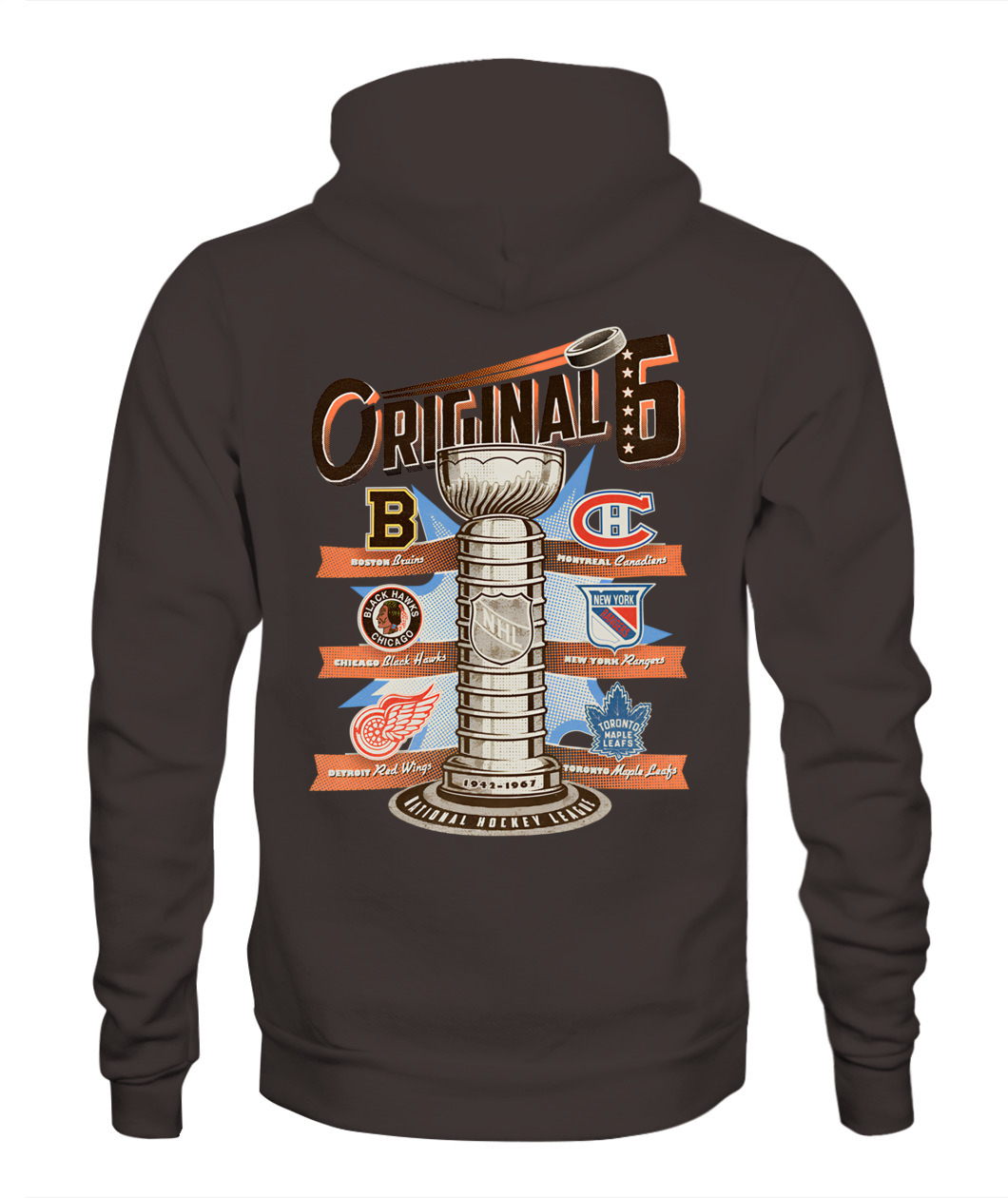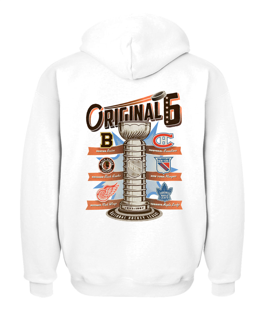 The ultimate tribute! This NHL Original Six Hoodie features the Stanley Cup trophy surrounded by the vintage logos of the six founding teams, celebrating the historic 1942-1967 era. 🏆🏒